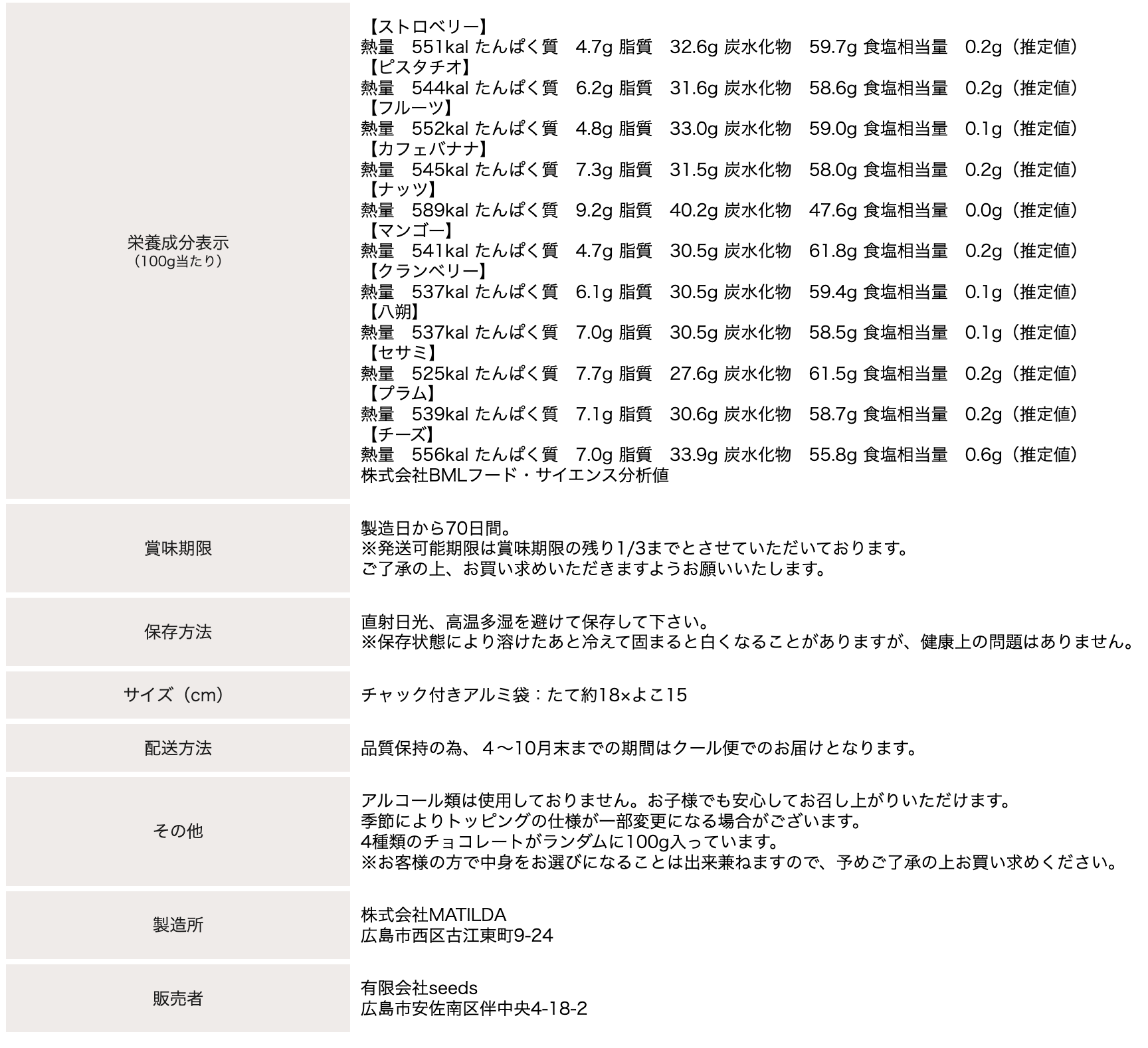 原材料名 | 【ストロベリー】 ホワイトチョコレート(ココアバター、砂糖、全粉乳)(国内製造)、小麦粉、砂糖、バター、卵、苺パウダー、アーモンドパウダー、クランベリー、ラズベリー、苺、苺クリスピー、木苺クリスピー、ココナッツ、食塩/レシチン、香料(一部に小麦・卵・乳成分・アーモンド・大豆を含む) 【ピスタチオ】 ホワイトチョコレート(ココアバター、砂糖、全粉乳)(国内製造)、ピスタチオペースト、小麦粉、砂糖、バター、卵、アーモンドパウダー、クランベリー、ラズベリー、グリーンレーズン、ココナッツ、食塩/レシチン、香料(一部に小麦・卵・乳成分・アーモンド・大豆を含む) 【フルーツ】 ホワイトチョコレート(ココアバター、砂糖、全粉乳)(国内製造)、小麦粉、砂糖、バター、卵、ヨーグルトパウダー、アーモンドパウダー、パイン、苺、キウイ、グリーンレーズン、クランベリー、ココナッツ、食塩/レシチン、香料(一部に小麦・卵・乳成分・キウイフルーツ・アーモンド・大豆を含む) 【カフェバナナ】 ミルクチョコレート(砂糖、ココアバター、全粉乳、カカオマス)(国内製造)、ヘーゼルナッツペースト、小麦粉、砂糖、バター、卵、コーヒー豆、アーモンドパウダー、ヘーゼルナッツ、カカオニブ、バナナ、食塩/レシチン、香料(一部に小麦・卵・乳成分・バナナ・アーモンド・大豆を含む) 【ナッツ】 ビターチョコレート(カカオマス、砂糖、ココアバター)(国内製造)、アーモンドペースト、小麦粉、砂糖、バター、卵、アーモンドパウダー、アーモンド、ヘーゼルナッツ、カシューナッツ、くるみ、カカオニブ、食塩/レシチン、香料(一部に小麦・卵・乳成分・くるみ・カシューナッツ・アーモンド・大豆を含む) 【マンゴー】 ホワイトチョコレート(ココアバター、砂糖、全粉乳)(国内製造)、小麦粉、砂糖、バター、卵、マンゴーパウダー、アーモンドパウダー、パイナップル、マンゴー、パッションフルーツクリスピー、ココナッツ、食塩/レシチン、香料(一部に小麦・卵・乳成分・アーモンド・大豆を含む) 【クランベリー】 ビターチョコレート(カカオマス、砂糖、ココアバター)(国内製造)、小麦粉、砂糖、バター、卵、アーモンドパウダー、クランベリー、グリーンレーズン、アーモンド、食塩/レシチン、香料(一部に小麦・卵・乳成分・アーモンド・大豆を含む) 【オレンジ(八朔)】 ビターチョコレート(カカオマス、砂糖、ココアバター)(国内製造)、アーモンドペースト、小麦粉、砂糖、バター、八朔ピール(八朔、砂糖、水あめ)、卵、アーモンドパウダー、アーモンド、カカオニブ、食塩/レシチン、香料(一部に小麦・卵・乳成分・アーモンド・大豆を含む) 【セサミ】 ミルクチョコレート(砂糖、ココアバター、全粉乳、カカオマス)(国内製造)、ゴマペースト、小麦粉、砂糖、バター、卵、アーモンドパウダー、ゴマ、グリーンレーズン、食塩/レシチン、香料(一部に小麦・卵・乳成分・ゴマ・アーモンド・大豆を含む) 【プラム】 ミルクチョコレート(砂糖、ココアバター、全粉乳、カカオマス)(国内製造)、小麦粉、砂糖、バター、卵、アーモンドパウダー、カシューナッツ、プラム、カカオニブ、食塩/レシチン、香料(一部に小麦・卵・乳成分・カシューナッツ・アーモンド・大豆を含む) 【フロマージュ(チーズ)】 ホワイトチョコレート(ココアバター、砂糖、全粉乳)(国内製造)、小麦粉、砂糖、バター、卵、チーズパウダー、アーモンド、オレンジ、グリーンレーズン、食塩/レシチン、香料(一部に小麦・卵・乳成分・オレンジ・アーモンド・大豆を含む) |