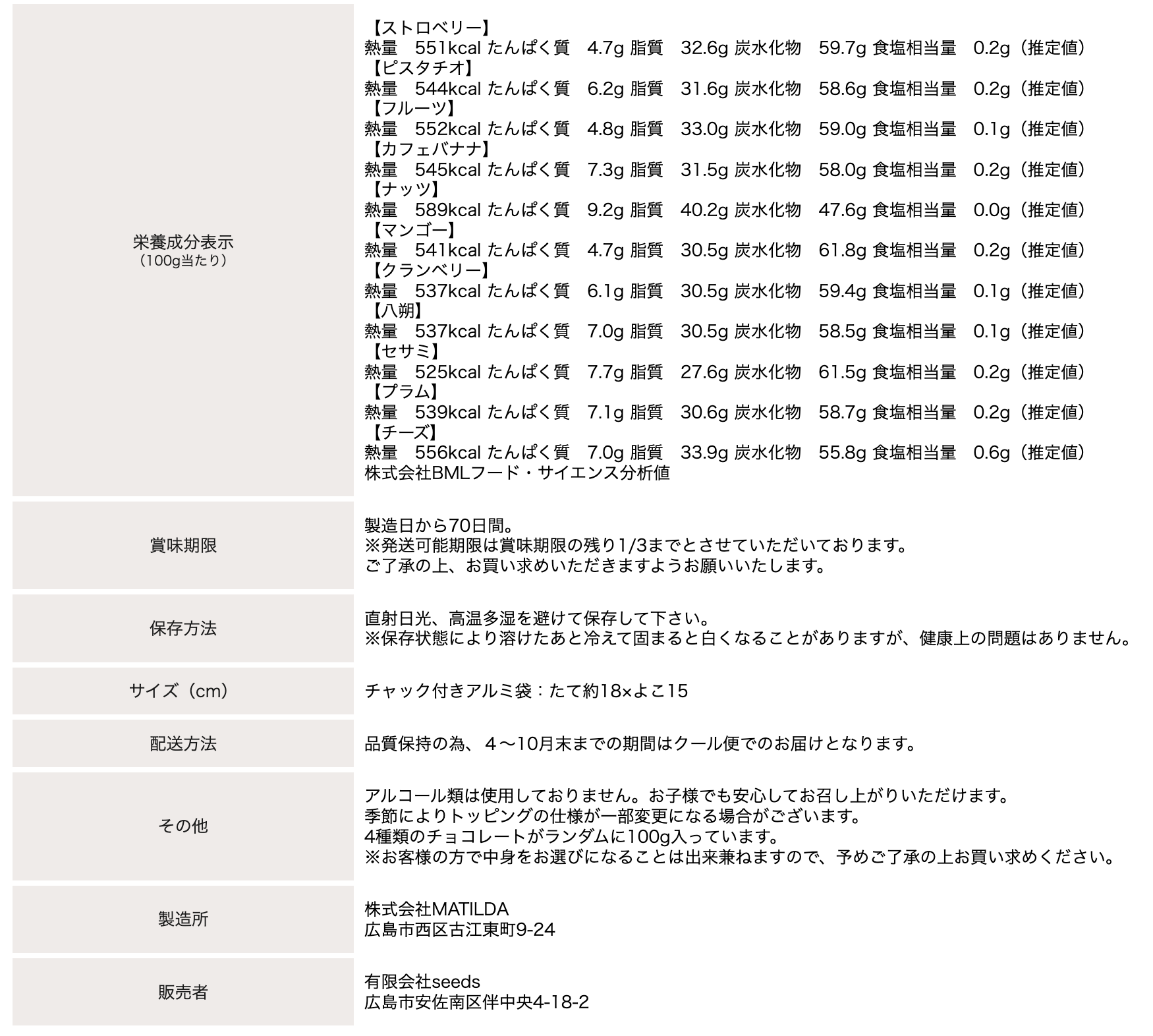 | その他 | アルコール類は使用しておりません。お子様でも安心してお召し上がりいただけます。 季節によりトッピングの仕様が一部変更になる場合がございます。 4種類のチョコレートがランダムに100g入っています。 ※お客様の方で中身をお選びになることは出来兼ねますので、予めご了承の上お買い求めください。 |