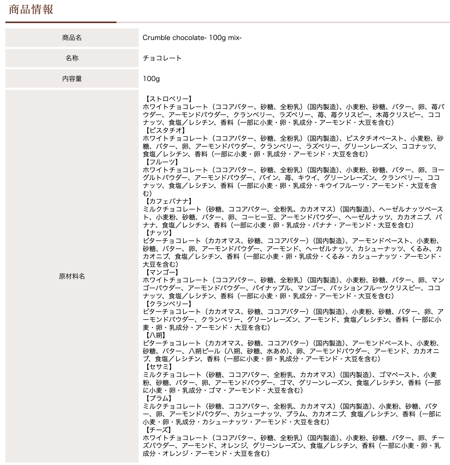 | 原材料名 | 【ストロベリー】 ホワイトチョコレート(ココアバター、砂糖、全粉乳)(国内製造)、小麦粉、砂糖、バター、卵、苺パウダー、アーモンドパウダー、クランベリー、ラズベリー、苺、苺クリスピー、木苺クリスピー、ココナッツ、食塩/レシチン、香料(一部に小麦・卵・乳成分・アーモンド・大豆を含む) 【ピスタチオ】 ホワイトチョコレート(ココアバター、砂糖、全粉乳)(国内製造)、ピスタチオペースト、小麦粉、砂糖、バター、卵、アーモンドパウダー、クランベリー、ラズベリー、グリーンレーズン、ココナッツ、食塩/レシチン、香料(一部に小麦・卵・乳成分・アーモンド・大豆を含む) 【フルーツ】 ホワイトチョコレート(ココアバター、砂糖、全粉乳)(国内製造)、小麦粉、砂糖、バター、卵、ヨーグルトパウダー、アーモンドパウダー、パイン、苺、キウイ、グリーンレーズン、クランベリー、ココナッツ、食塩/レシチン、香料(一部に小麦・卵・乳成分・キウイフルーツ・アーモンド・大豆を含む) 【カフェバナナ】 ミルクチョコレート(砂糖、ココアバター、全粉乳、カカオマス)(国内製造)、ヘーゼルナッツペースト、小麦粉、砂糖、バター、卵、コーヒー豆、アーモンドパウダー、ヘーゼルナッツ、カカオニブ、バナナ、食塩/レシチン、香料(一部に小麦・卵・乳成分・バナナ・アーモンド・大豆を含む) 【ナッツ】 ビターチョコレート(カカオマス、砂糖、ココアバター)(国内製造)、アーモンドペースト、小麦粉、砂糖、バター、卵、アーモンドパウダー、アーモンド、ヘーゼルナッツ、カシューナッツ、くるみ、カカオニブ、食塩/レシチン、香料(一部に小麦・卵・乳成分・くるみ・カシューナッツ・アーモンド・大豆を含む) 【マンゴー】 ホワイトチョコレート(ココアバター、砂糖、全粉乳)(国内製造)、小麦粉、砂糖、バター、卵、マンゴーパウダー、アーモンドパウダー、パイナップル、マンゴー、パッションフルーツクリスピー、ココナッツ、食塩/レシチン、香料(一部に小麦・卵・乳成分・アーモンド・大豆を含む) 【クランベリー】 ビターチョコレート(カカオマス、砂糖、ココアバター)(国内製造)、小麦粉、砂糖、バター、卵、アーモンドパウダー、クランベリー、グリーンレーズン、アーモンド、食塩/レシチン、香料(一部に小麦・卵・乳成分・アーモンド・大豆を含む) 【オレンジ(八朔)】 ビターチョコレート(カカオマス、砂糖、ココアバター)(国内製造)、アーモンドペースト、小麦粉、砂糖、バター、八朔ピール(八朔、砂糖、水あめ)、卵、アーモンドパウダー、アーモンド、カカオニブ、食塩/レシチン、香料(一部に小麦・卵・乳成分・アーモンド・大豆を含む) 【セサミ】 ミルクチョコレート(砂糖、ココアバター、全粉乳、カカオマス)(国内製造)、ゴマペースト、小麦粉、砂糖、バター、卵、アーモンドパウダー、ゴマ、グリーンレーズン、食塩/レシチン、香料(一部に小麦・卵・乳成分・ゴマ・アーモンド・大豆を含む) 【プラム】 ミルクチョコレート(砂糖、ココアバター、全粉乳、カカオマス)(国内製造)、小麦粉、砂糖、バター、卵、アーモンドパウダー、カシューナッツ、プラム、カカオニブ、食塩/レシチン、香料(一部に小麦・卵・乳成分・カシューナッツ・アーモンド・大豆を含む) 【フロマージュ(チーズ)】 ホワイトチョコレート(ココアバター、砂糖、全粉乳)(国内製造)、小麦粉、砂糖、バター、卵、チーズパウダー、アーモンド、オレンジ、グリーンレーズン、食塩/レシチン、香料(一部に小麦・卵・乳成分・オレンジ・アーモンド・大豆を含む) |