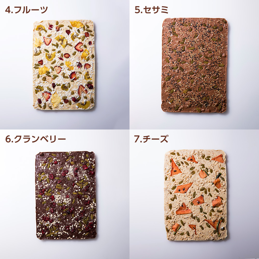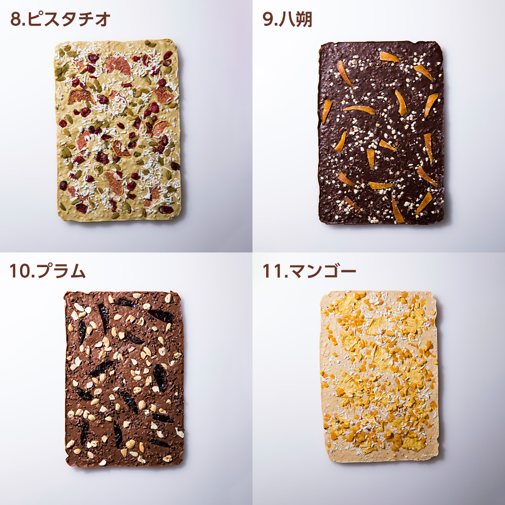ラインナップは全部で11種類。その中から4種類のチョコレートがランダムに合計で約100g入ったお得なセットになっています。