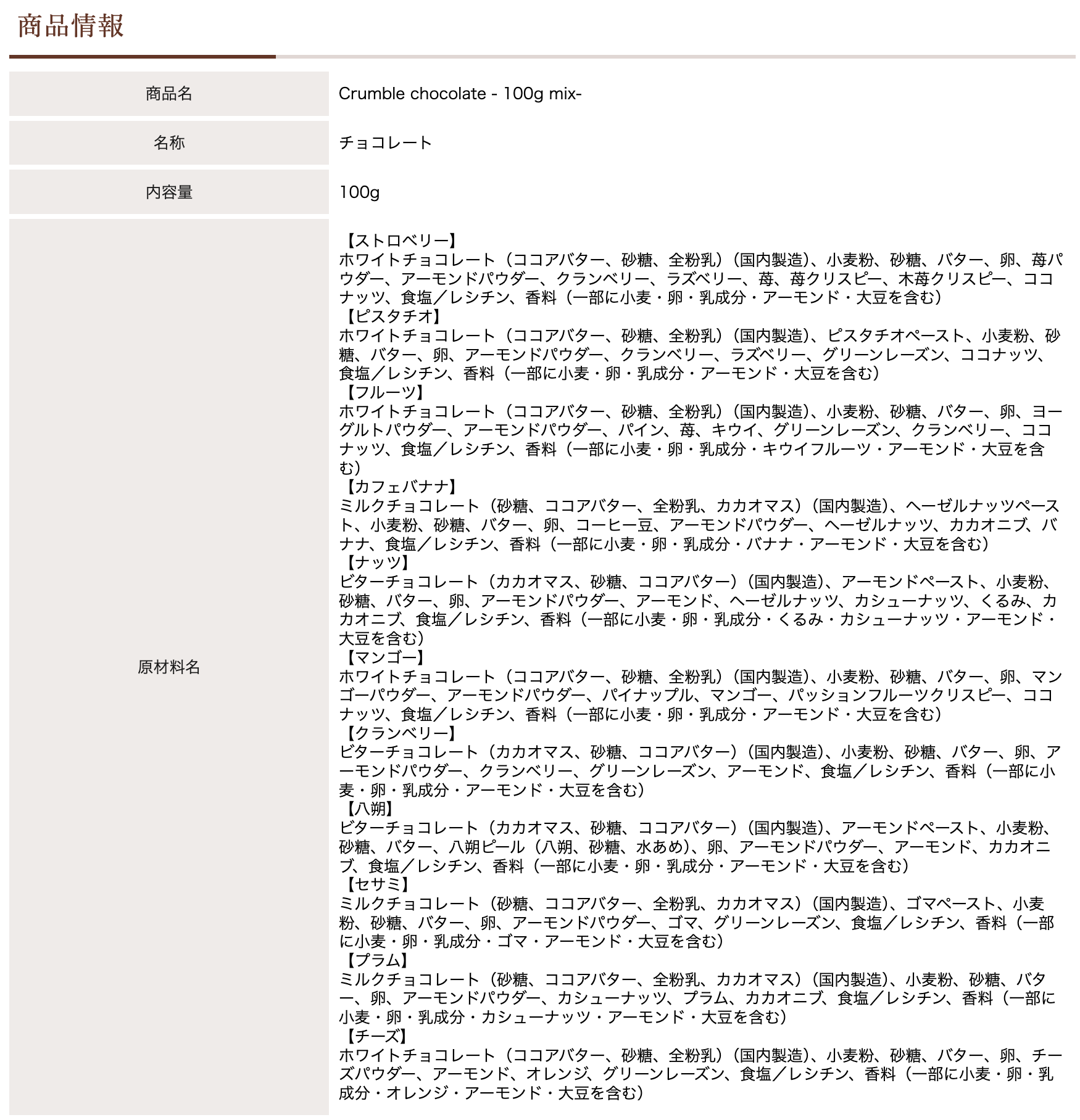 | 原材料名 | 【ストロベリー】 ホワイトチョコレート(ココアバター、砂糖、全粉乳)(国内製造)、小麦粉、砂糖、バター、卵、苺パウダー、アーモンドパウダー、クランベリー、ラズベリー、苺、苺クリスピー、木苺クリスピー、ココナッツ、食塩/レシチン、香料(一部に小麦・卵・乳成分・アーモンド・大豆を含む) 【ピスタチオ】 ホワイトチョコレート(ココアバター、砂糖、全粉乳)(国内製造)、ピスタチオペースト、小麦粉、砂糖、バター、卵、アーモンドパウダー、クランベリー、ラズベリー、グリーンレーズン、ココナッツ、食塩/レシチン、香料(一部に小麦・卵・乳成分・アーモンド・大豆を含む) 【フルーツ】 ホワイトチョコレート(ココアバター、砂糖、全粉乳)(国内製造)、小麦粉、砂糖、バター、卵、ヨーグルトパウダー、アーモンドパウダー、パイン、苺、キウイ、グリーンレーズン、クランベリー、ココナッツ、食塩/レシチン、香料(一部に小麦・卵・乳成分・キウイフルーツ・アーモンド・大豆を含む) 【カフェバナナ】 ミルクチョコレート(砂糖、ココアバター、全粉乳、カカオマス)(国内製造)、ヘーゼルナッツペースト、小麦粉、砂糖、バター、卵、コーヒー豆、アーモンドパウダー、ヘーゼルナッツ、カカオニブ、バナナ、食塩/レシチン、香料(一部に小麦・卵・乳成分・バナナ・アーモンド・大豆を含む) 【ナッツ】 ビターチョコレート(カカオマス、砂糖、ココアバター)(国内製造)、アーモンドペースト、小麦粉、砂糖、バター、卵、アーモンドパウダー、アーモンド、ヘーゼルナッツ、カシューナッツ、くるみ、カカオニブ、食塩/レシチン、香料(一部に小麦・卵・乳成分・くるみ・カシューナッツ・アーモンド・大豆を含む) 【マンゴー】 ホワイトチョコレート(ココアバター、砂糖、全粉乳)(国内製造)、小麦粉、砂糖、バター、卵、マンゴーパウダー、アーモンドパウダー、パイナップル、マンゴー、パッションフルーツクリスピー、ココナッツ、食塩/レシチン、香料(一部に小麦・卵・乳成分・アーモンド・大豆を含む) 【クランベリー】 ビターチョコレート(カカオマス、砂糖、ココアバター)(国内製造)、小麦粉、砂糖、バター、卵、アーモンドパウダー、クランベリー、グリーンレーズン、アーモンド、食塩/レシチン、香料(一部に小麦・卵・乳成分・アーモンド・大豆を含む) 【オレンジ(八朔)】 ビターチョコレート(カカオマス、砂糖、ココアバター)(国内製造)、アーモンドペースト、小麦粉、砂糖、バター、八朔ピール(八朔、砂糖、水あめ)、卵、アーモンドパウダー、アーモンド、カカオニブ、食塩/レシチン、香料(一部に小麦・卵・乳成分・アーモンド・大豆を含む) 【セサミ】 ミルクチョコレート(砂糖、ココアバター、全粉乳、カカオマス)(国内製造)、ゴマペースト、小麦粉、砂糖、バター、卵、アーモンドパウダー、ゴマ、グリーンレーズン、食塩/レシチン、香料(一部に小麦・卵・乳成分・ゴマ・アーモンド・大豆を含む) 【プラム】 ミルクチョコレート(砂糖、ココアバター、全粉乳、カカオマス)(国内製造)、小麦粉、砂糖、バター、卵、アーモンドパウダー、カシューナッツ、プラム、カカオニブ、食塩/レシチン、香料(一部に小麦・卵・乳成分・カシューナッツ・アーモンド・大豆を含む) 【フロマージュ(チーズ)】 ホワイトチョコレート(ココアバター、砂糖、全粉乳)(国内製造)、小麦粉、砂糖、バター、卵、チーズパウダー、アーモンド、オレンジ、グリーンレーズン、食塩/レシチン、香料(一部に小麦・卵・乳成分・オレンジ・アーモンド・大豆を含む) |